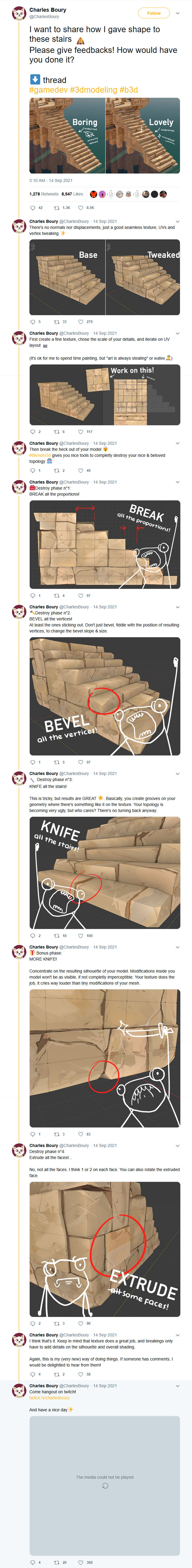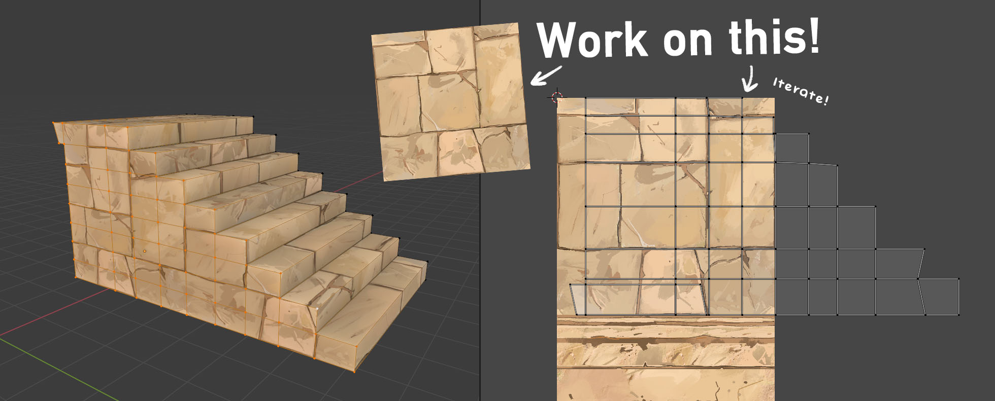 Once, I made a well received thread on twitter (now deleted) sharing how I work with tilable textures on 3d models, taking stairs as an example. I presented a reverse approach from the usual workflow. It gathered 8k likes in a few hours. I was very proud.