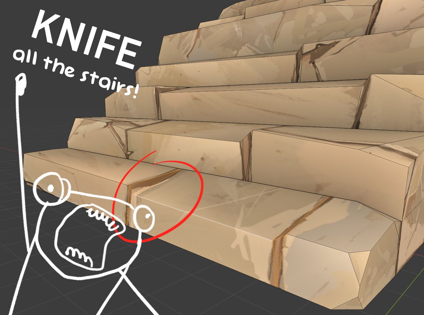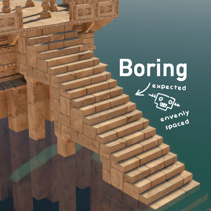 I know, real stairs avoid this at all cost, but we're not recreating the real world. Insert oddities here. But like before when designing the texture, don't create something too distinctive. Move things to prevent visual repetition.