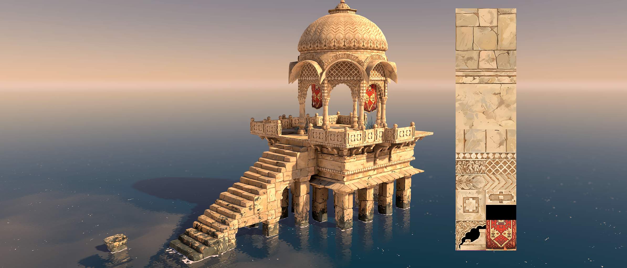 You can see more details of my Indian Temple on my portfolio, how I used trimsheets and shaders for the rest of the temple.