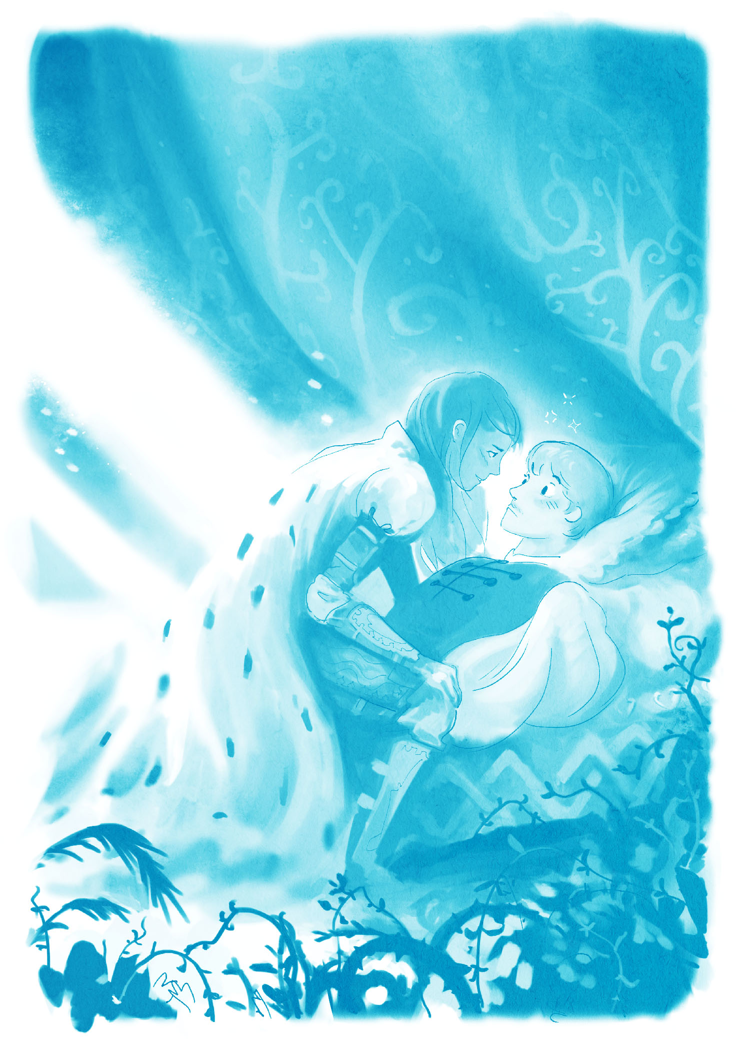 Lucile wrote the text, I drew the illutrations. We worked on "Le Beau Au Bois Dormant" (Sleeping handsome), the knight-woman arriving all frisky on her horse, looking to free the poor indolent prince. Also, it's not traditional watercolor! It's digital, but it's the watercolor brush.